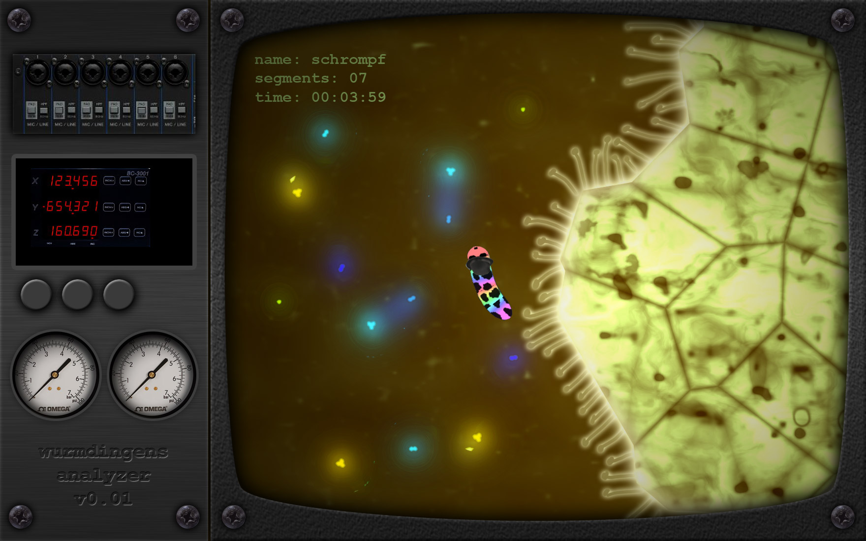Trotzdem, wäre ich Art-Director dieses Spiels, würde ich wohl mal versuchen, Umgebung wie Hintergrund, Zellen, Tentakel etwas "realistischer" mit Durchlichteffekt, Parallax und Tiefen(un)schärfe zu rendern, die Würmer und Nahrung dagegen im Kontrast so wie sie sind comichaft. Und als UI-Style vielleicht 80er Laborgeräte imitieren.