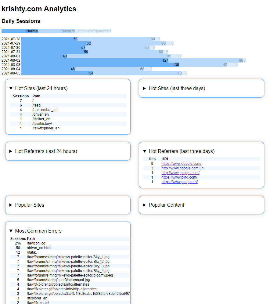 Ich bin zu blöd und zu faul, meinen eigenen Server zu betreiben. Also hoste ich bei 1&1. Die haben ein Analyse-Tool, aber das hat letzten Monat die Hits auf eine meiner Seiten einfach so gedrittelt. Ohne Grund. Und da kamen mir Zweifel, wie genau das Ganze ist. Für eine andere Seite stammen fast alle angezeigten Daten offensichtlich von Spambots und Hacking-Versuchen. Dann habe ich mir die rohen Logs runtergeladen – scheint Apache zu sein?! – und mich auf die Suche nach was anderem gemacht.