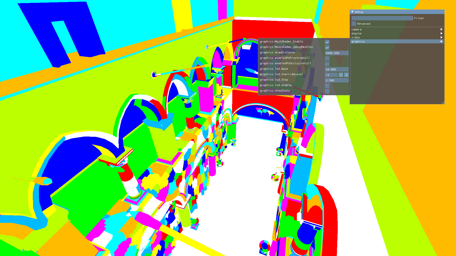 Auf dem Bild zu sehen mein Debug Modus der die Dreieckscluster (aka Meshlets in Nvidia Sprache) in unterschiedlichen Farben anzeigt.