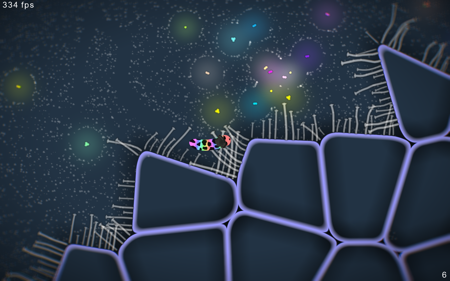 Nächster Schritt nach dem Hübschmachen: Umherschieben durch passierende Würmern, Wegwabbern von Wänden, Wegschubsen der Grauen Partikel, dann irgendwann Platzen bei Penetration und dem Gameplay, dass sich dadurch ergibt.