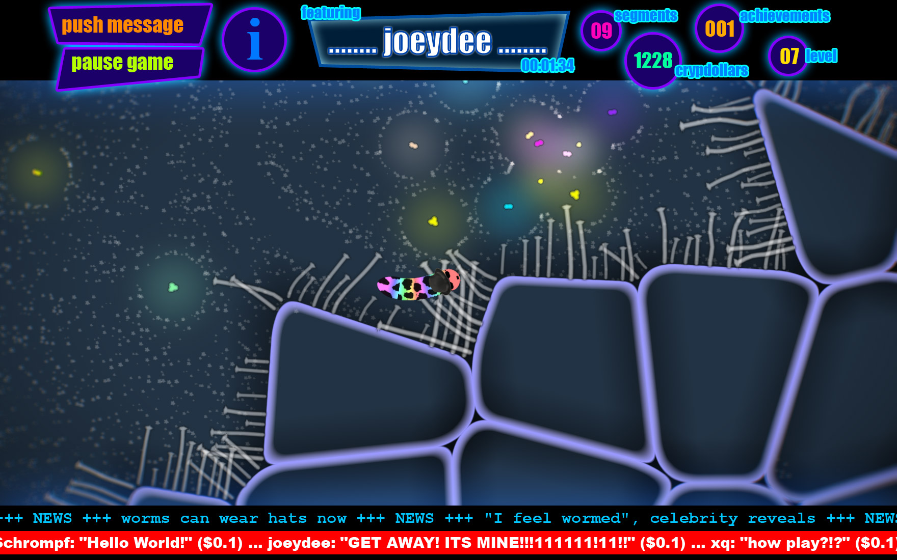 Die InGame-Währung steht: es gibt DNA-Schnipsel, sie sind auch außerhalb des Bildschirms weithin sichtbar, man kann sie einsammeln, sie werden ne Weile verdaut und dabei am Wurm prominent angezeigt, was hoffentlich Begehrlichkeiten anderer Spielerinnen weckt. Irgendwann werden sie verdaut, aber bewirken noch nichts. Das kommt als nächstes