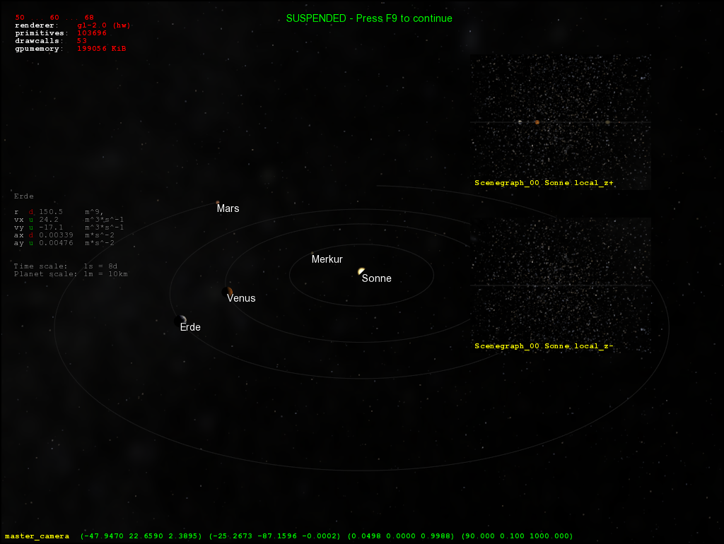 • 50 MiB Texturdaten (Albedo und Normalen beim Mond, allerdings nicht in dieser Demo, um Bandbreite zu sparen) sind auch heute noch ziemlich viel; erst recht für einen letztendlich meist 15×15 Pixel kleinen Punkt.