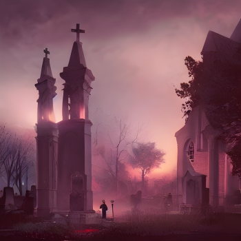 DALL·E 2022-09-24 22.48.20 - A graveyard at night. Zombies everywhere. A small church with red-lit windows is in the background. sharp focus, wide shot, trending on artstation, ma.png