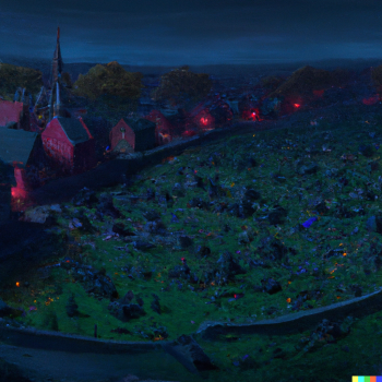 DALL·E 2022-09-24 22.47.59 - A graveyard at night. Zombies everywhere. A small church with red-lit windows is in the background. sharp focus, wide shot, trending on artstation, ma.png