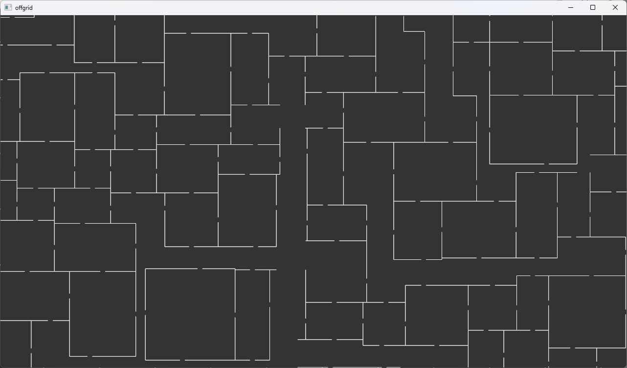 Neue Experimente mit unregelmäßigem Rechteck-Partitioning. Vielleicht eignet sich das ebenfalls für Räume/Dungeons. Durchgänge verteilen ist leider nicht so offensichtlich wie bei binary, muss ich mal untersuchen ob ich da auch eine lokale Regel finde.