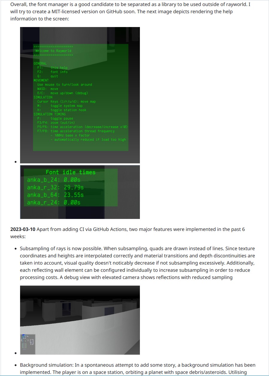 Hinzu kam eine kleine Ergänzung: "hot shader reload". Natürlich ist es sehr einfach und plausibel, auf Knopfdruck die Shader im laufenden Betrieb nachzuladen, aber irgendwie habe ich nie so richtig drüber nachgedacht. Und weil es gerade so spannend war, wurde der Knopfdruck durch "inotify" auf dem Linux-Dateisystem ersetzt. Schon sehr nett und praktisch zum Shaderentwickeln. Für andere Plattformen wird der Teil derzeit nicht mitkompiliert, hier ist weiterhin der Knopfdruck notwendig. Es wird sicherlich auch ähnliche Mechanismen auf den anderen Plattformen wie Windows geben, aber das ist dann die Kür, wenn ich mal die Muße habe, mich damit zu beschäftigen.