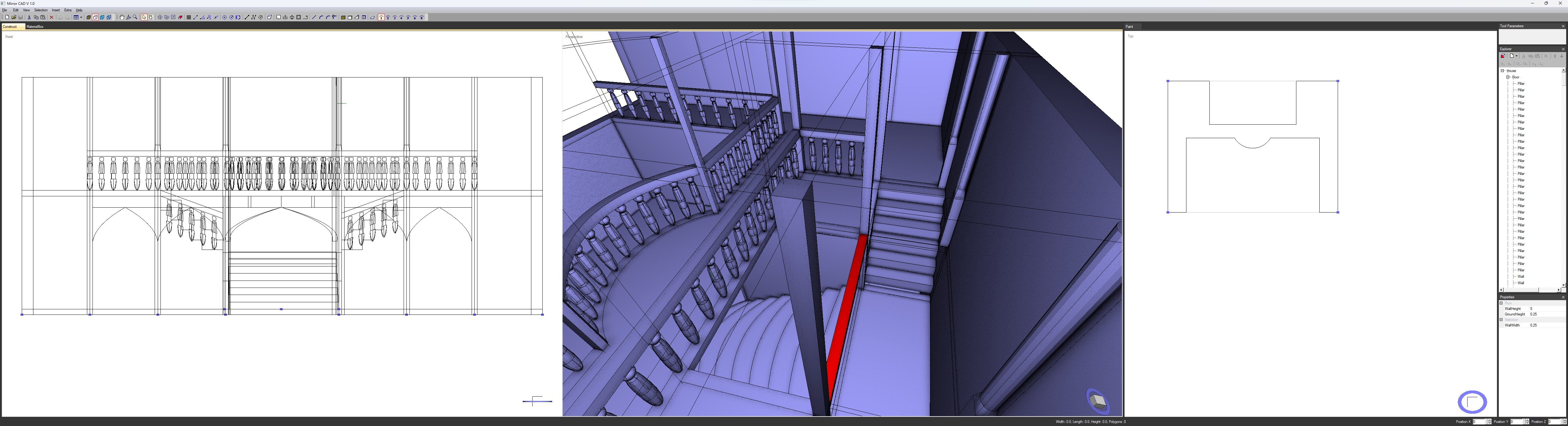 Habe eben ein halbwegs größeres Modell erstellt. Es ähnelt Starcows megageilem Modell. Ich habe die untere Etage nicht zu Ende modelliert. Es wären noch Säulen notwendig und ein anderer Bogen. Im Moment habe ich die Schnauze voll vom modellieren. 3 Stunden habe ich gebraucht. Bin aber nicht enttäuscht, immerhin läuft MirrorCAD stabil. Der Explorer ist extrem unübersichtlich mit seinem hierarchischem Content. Das will ich demnächst in anderer Weise gestalten. Obwohl ich das Treppensystem selbst gestaltet habe, musste ich erst überlegen, wie ich das mit dem Programm erstelle.