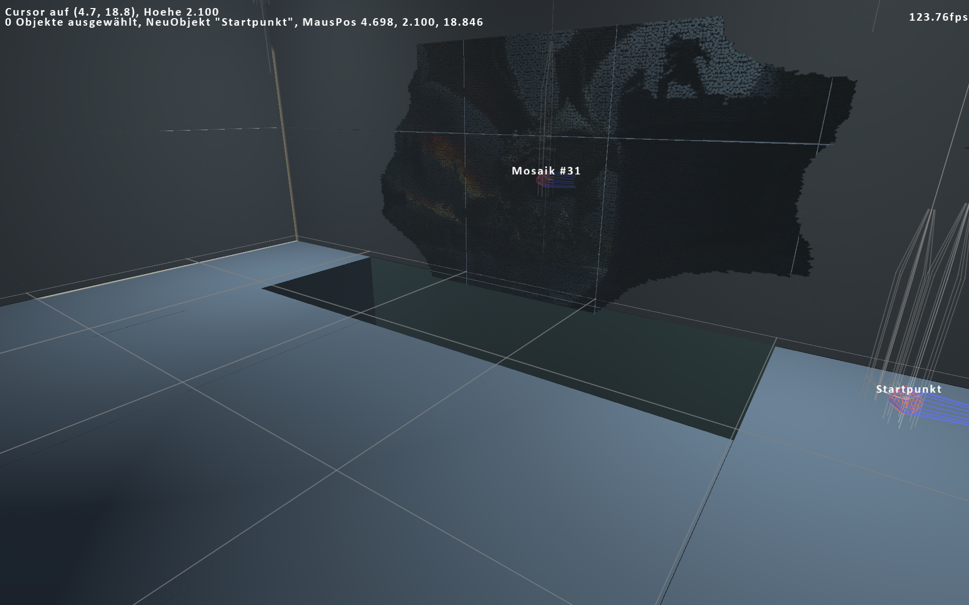 Wenn man das Kasper-Rätsel löst, kommt man in einen Raum mit nem großen Wand-Mosaik. Und ich stellte fest, dass es dort so zappenduster ist, dass man das gleich gar nicht erkennt. Also habe ich jetzt auf die Schnelle Punktlichtquellen eingebaut, bislang ohne Schatten.