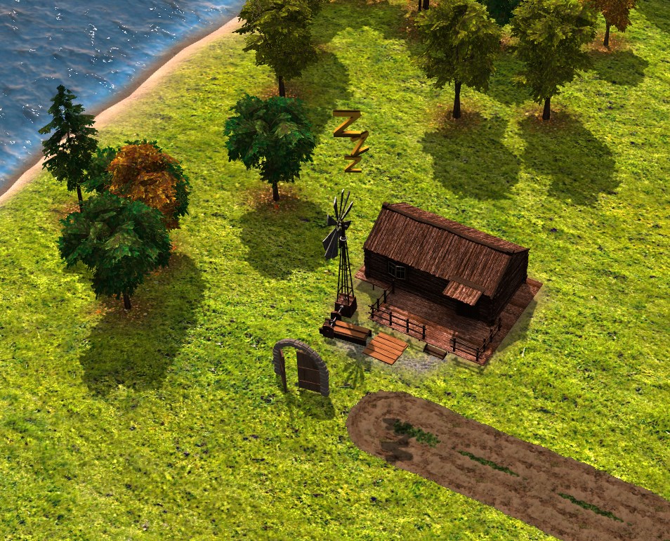Hier sieht man einen Holzfäller. Die Straße Endet an der falsche Stelle, daher ist daneben das Tür-Icon. Oben drüber schwebt das Idle-Icon um anzuzeigen, dass die Arbeit gerade pausiert ist. Das Idle-Icon hüpft auf und ab und dreht sich, ein ähnlicher Effekt fehlt noch für die Tür. Dann ist es hoffentlich auch etwas klarer, dass es ein Icon und kein Teil des Gebäudes ist. Aber vermutlich sollte ich noch zumindest die Texturen heller und gesättigter machen um es klarer abzugrenzen.