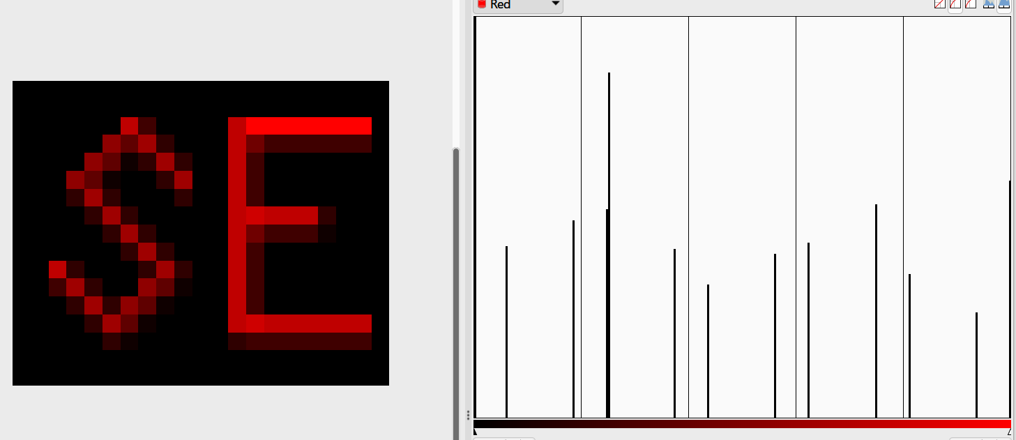 Hier mal die ersten 2 Buchstaben von "Select", in Gimp, mit Histogramm auf der rechten Seite. Es gibt ungefähr 10 verschiedene Rot-Töne, und zwar über die Gesamte Bandbreite, von Knallrot bis nahezu schwarz. Das E ist 2 Pixel breit, das S an den meisten Stellen 3 Pixel breit. Das ist einfach eine dünne Linie die schlecht rasterisiert ist. Entweder machst du das wirklich 1 Pixel breit und renderst das Pixel-perfekt in einem Rotton, oder du nimmst halt eine andere Schriftart. Aktuell erkennt man zwar, was der Stil sein soll, aber primär ist der Text schlecht lesbar, so das einem der Stil dann auch eher egal ist. Zumal der Stil ja auch aktuell noch gar nicht funktioniert, weil es einfach alles sehr offensichtlich unterschiedlich hell ist.