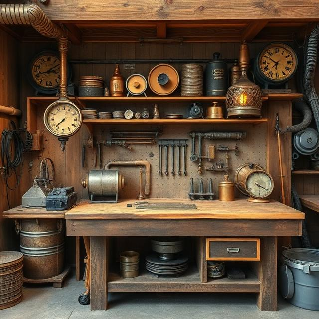 KI-erzeugte Steampunk-Workbench, nachdem ich endlich mal einen KI-Bildgenerator gefunden habe, der zumindest mal ein Bild produziert, bevor er mich auf tausend Wegen zum Bezahlen zwingen will: