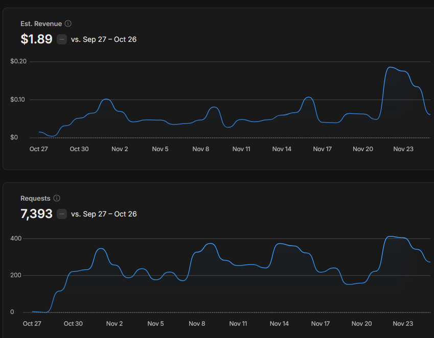 Ingame Werbung wurden gestern 204 abgespielt. Da die eCPM (also was man für 1000 Impressions bekommt) dort mit 0,30$ verdammt niedrig ist (EU und US haben 3,50$-4,50$), habe ich gestern also ca. 5ct verdient.