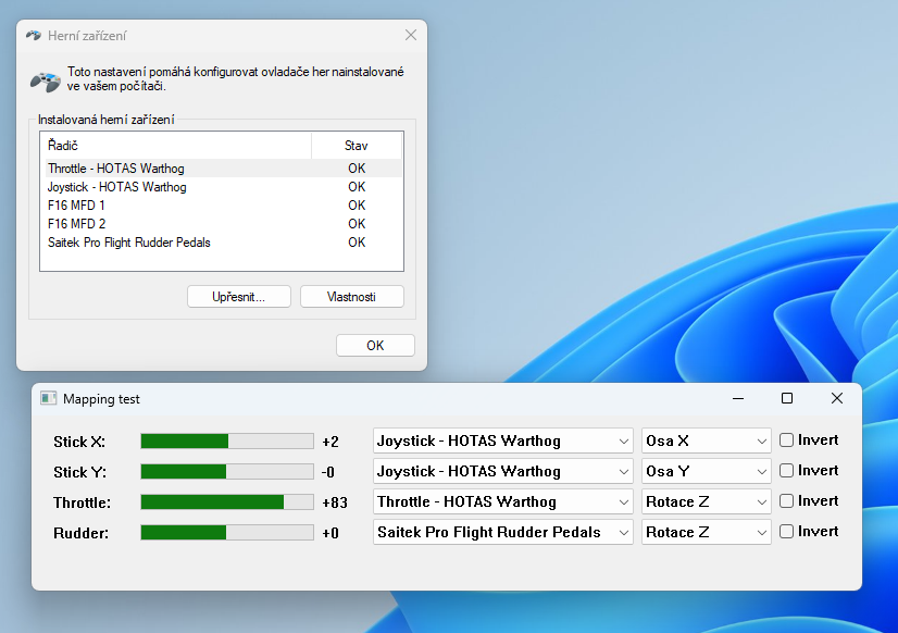 Wir haben also ganz schnell etwas zusammengeschmissen, das mehrere Eingabegeräte (mehrere DirectInput-Devices) unterstützt. Geht ja recht einfach in ~250 Zeilen C. Das habe ich an eine billige Win32-GUI geschraubt und an Beta-Tester verteilt, so dass die prüfen konnten, ob ihre Geräte und Achsen damit richtig erkannt werden.