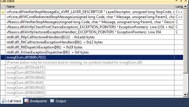 Ich debugge seit über 2 Stunden einen Crash ganz am Ende beim letzten Release() des ID3D11Device irgendwo tief drinnen in DestroyDriverInstance() laut MS Symbol Files. Ich habe inzwischen alles ausgepackt von Application Verifier bis hin zu Page Heaps mit vollen Traces und Vorwärts-/Rückwärts-Checks. Absolut keine Zusatzinformation. Ich hatte diese Crahes schonmal vor ca. 2 Monaten, konnte sie dann aber bis heute nicht mehr reproduzieren. Nun sind sie wieder da, spontan und unerklärlich.