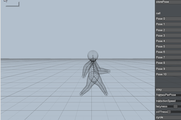 Im GIF ein kleiner Walk-Cycle und zwei Standposen an einem simplen Comic-Skelett. Wie man an den roten Linien sieht, läuft der Cycle recht rund, obwohl nur 4 Eckposen interpoliert werden. Nur das GIF ruckelt ein wenig.