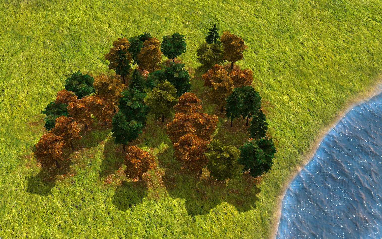 Das ist aber nur ein schneller kleiner Trick für Outdoor-Szenen. Du hast, denke ich, außerdem das Problem, dass Deine Oberflächen weithin identisch aussehen. Du bräuchtest etwas Varianz in den Wiesentexturen, vielleicht ne bräunliche Waldboden-Textur unter Bäumen, kleine Instancing-Meshes wie Gräser, Gebüsch, Schilf, Goldrute, Farn. Da hab ich theoretisch aus 10 Jahren Splitterwelten noch einige Modelle und Texturen rumliegen, die man auf die Schnelle einpflegen könnte. Alles hoffnungslos veraltet, was Polycount und Texturauflösung angeht, aber aus der Vogelperspektive reicht es sicher noch. Gibt dann natürlich Folgeprobleme, wie dass man Instanzen dann wieder entfernen muss, wenn sie durch Häuser oder Wege verdeckt werden. Oder dass sie sich im Wind bissl bewegen und ein bissl mehr, wenn ein Lebenwesen durchstreift.
