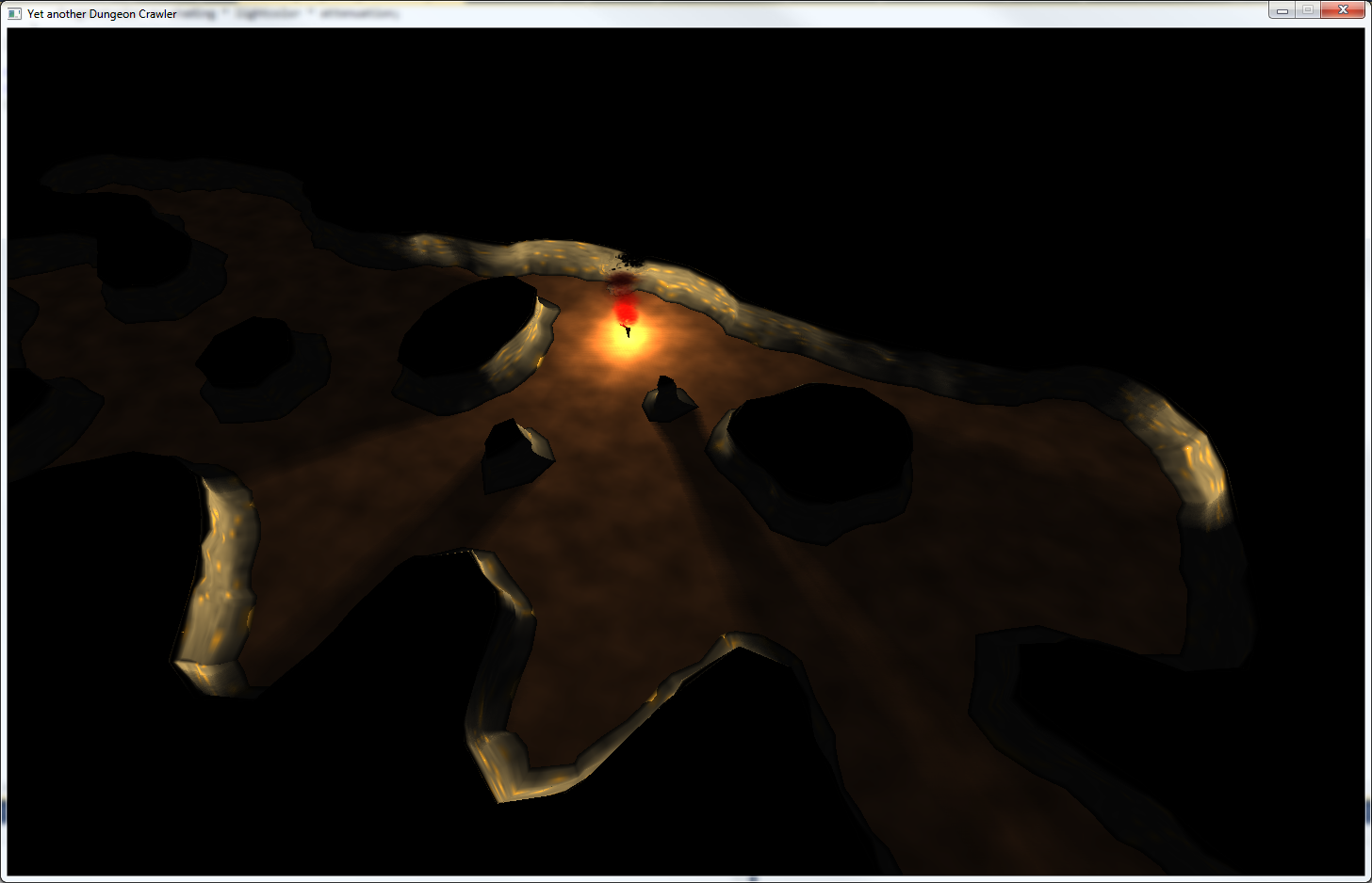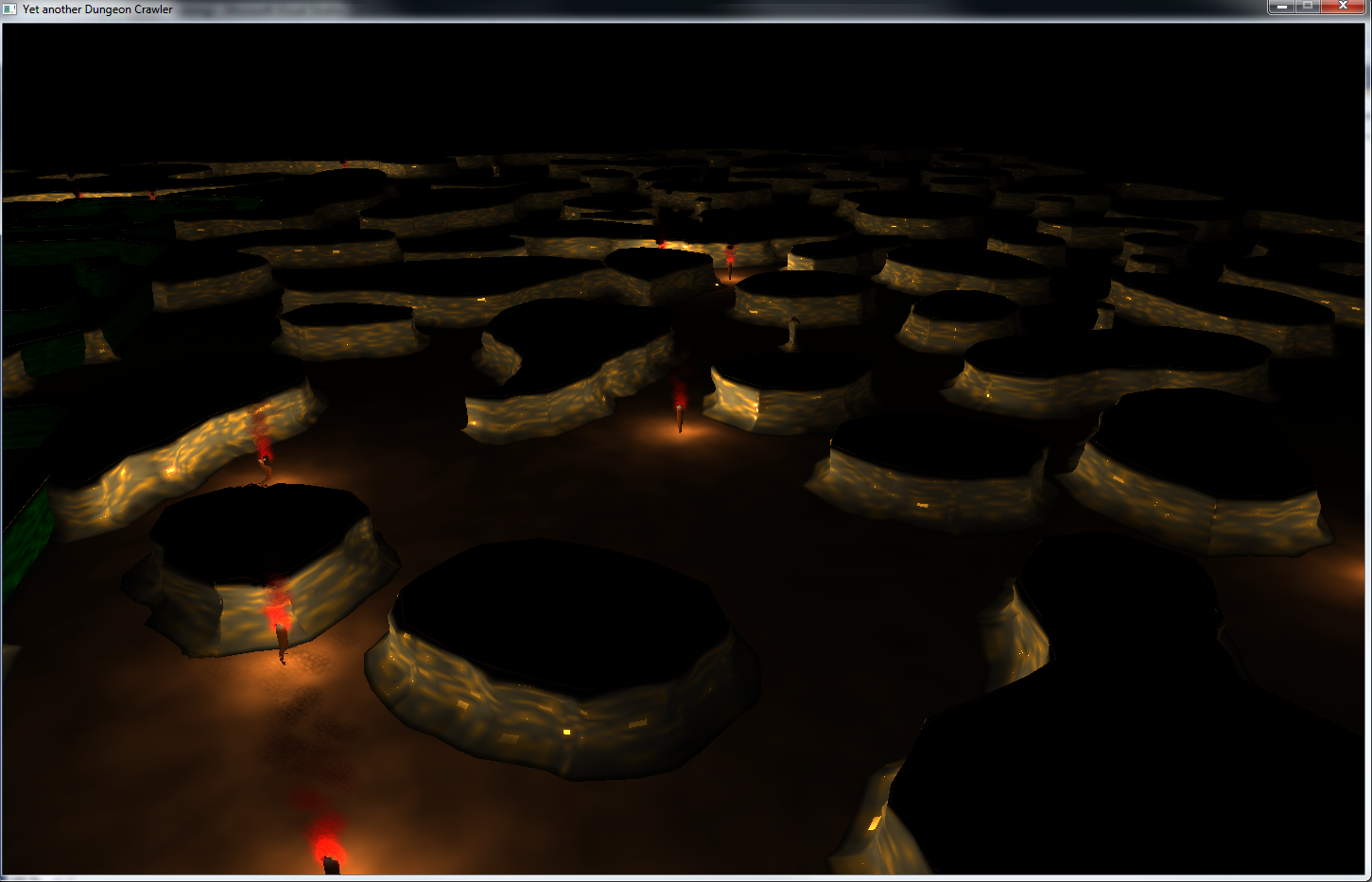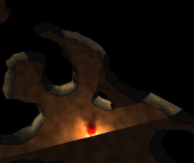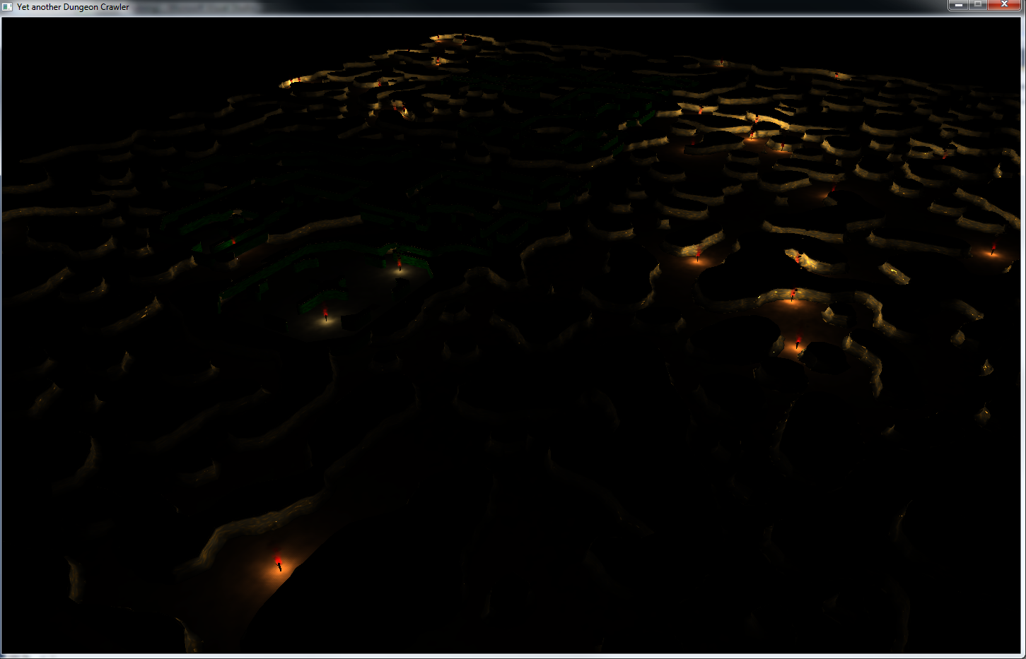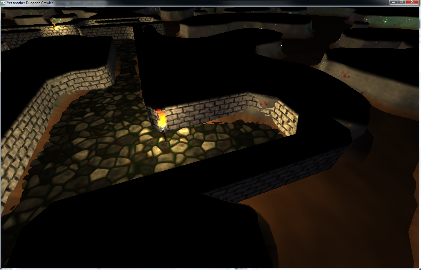 So, nun gibt es ein wenig mehr Beleuchtung, etwas bessere Wandgeometrien und rudimentäre Fackel-modelle (per Bézier-Kurven-Rotations-Körper ;) )