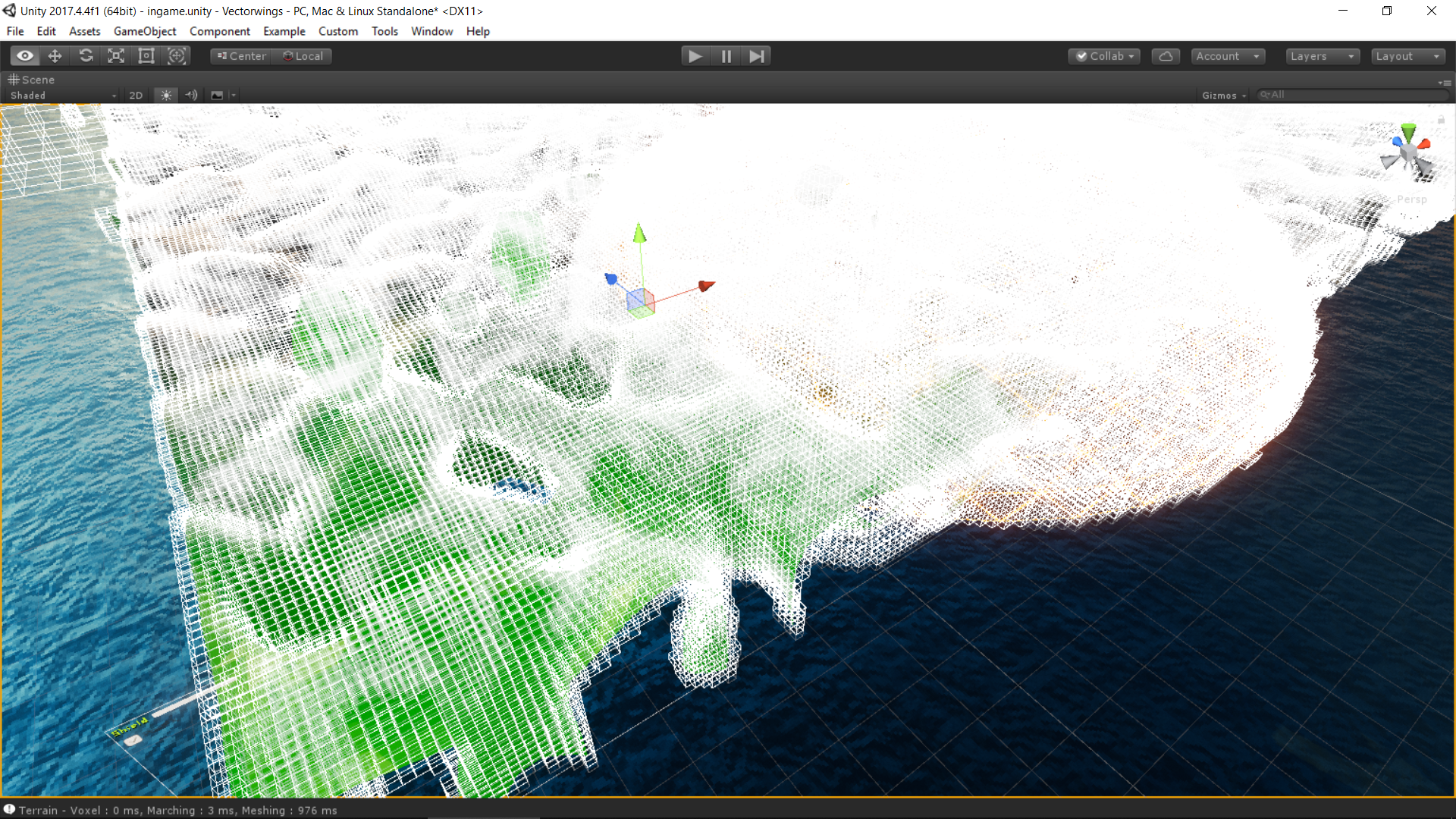 Da das Terrain sowieso schon in Chunks erstellt wird, habe ich es umgestellt, so dass jetzt 3 LOD Stufen gleichzeitig generiert werden und diese im Kamera-Umkreis dann entsprechend (konfigurierbar) umgeschaltet wird. Da sind jetzt noch keine so besonderen LOD-Übergänge an den Chunkkanten drin.