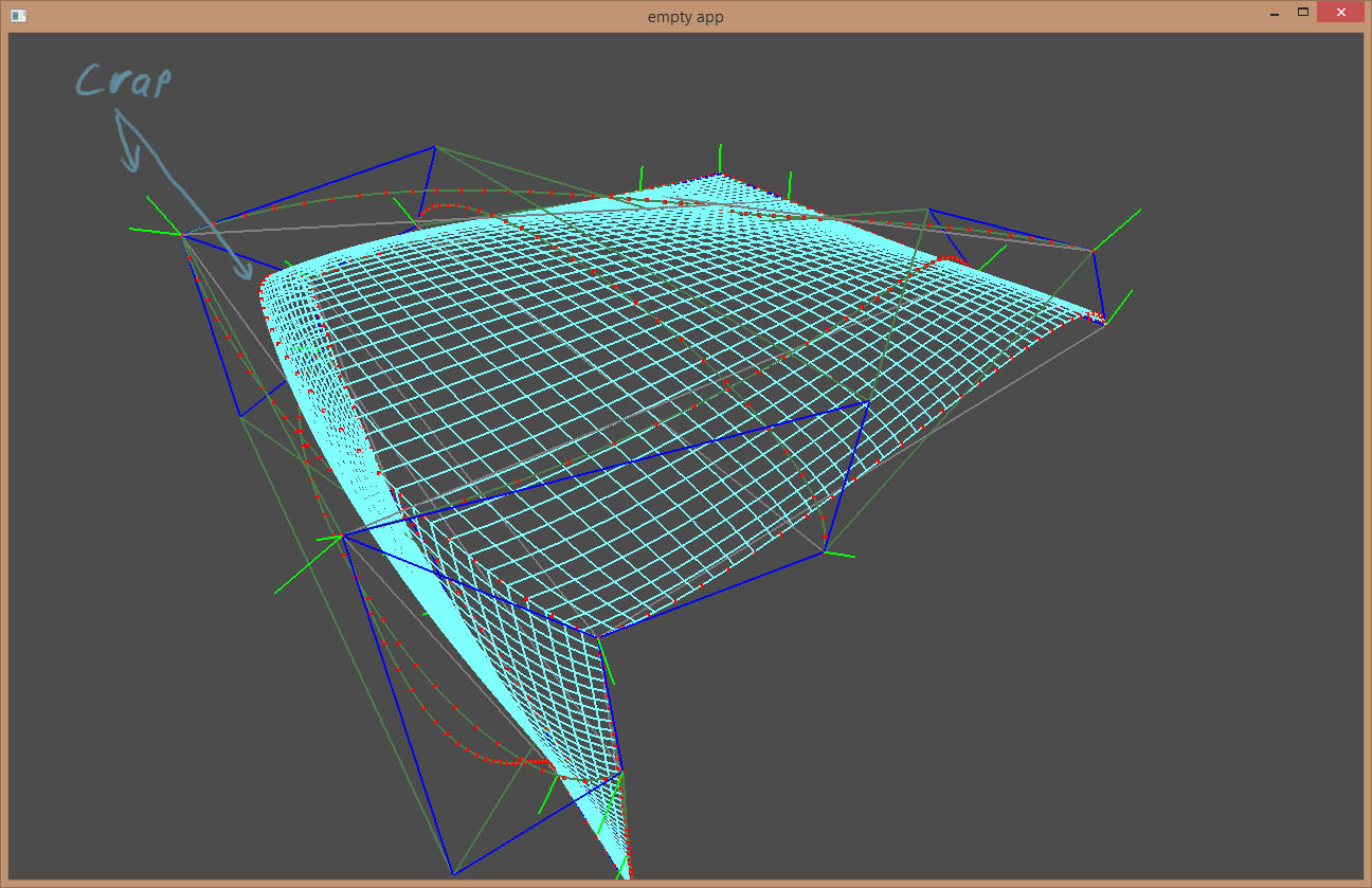 Nicht wirklich, aber ich weiß auch nicht, wie ich es wegkriegen soll. Die Position ist jetzt stetig, aber die erste Ableitung ist in der Mitte der Kanten nicht stetig. Irgendne Idee, wie ich dem beikommen könnte? Kann man sowas überhaupt von Bezier erwarten?