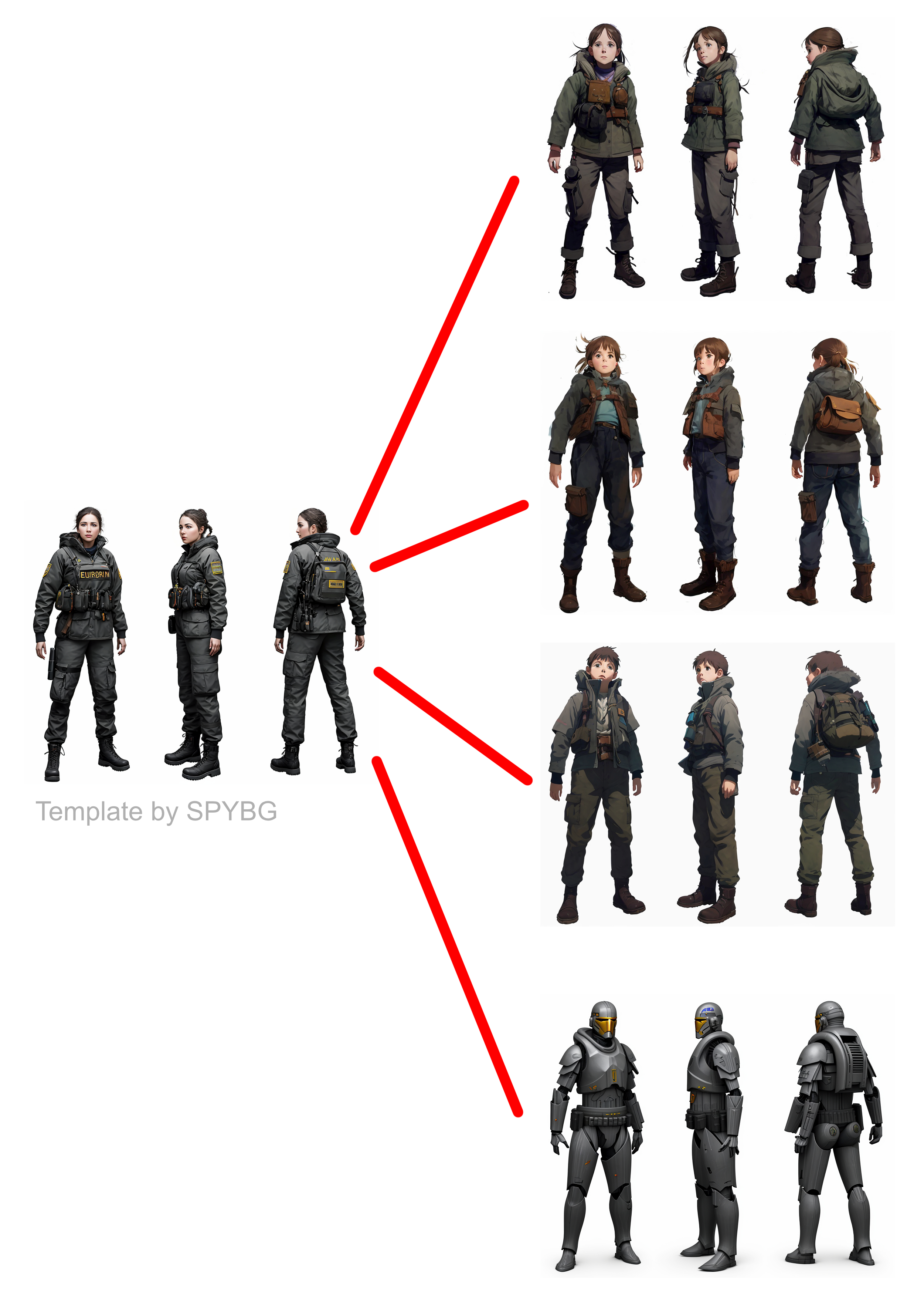 Praktisch wie oben mit den Assets. Nur: wenn man das mit einem geigneten KI-Modell und einer konsistenten Vorlage macht, hat man tatsächlich Chancen, dass ein einigermaßen konsistenter Turnaround herauskommt. Ein 3D-Grafiker namens Valentin Yovchev (SPYBG) hat freundlicherweise ein paar 3D-Templates seiner Arbeiten für genau diesen Zweck zur Verfügung gestellt.