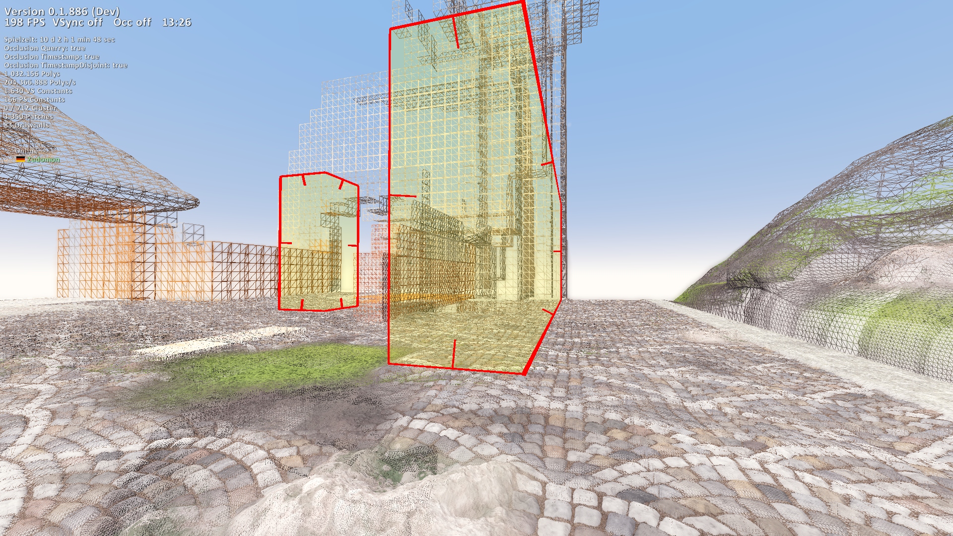 Richtig cool sieht das in Bewegung aus, wenn auf einmal alles hinter einem Occluder verschwindet. Ich weiß nicht seit wie vielen Jahren ich mir das Wireframe ansehe und denke, wäre das geil, wenn jetzt dass da hinter nicht mehr beachtet würde. Dass das auf einmal so funktioniert ist unglaublich. Da ist auch kein verspätetes einblenden wie mit den mistigen Occlusion Queries. Und klein flackern wegen zu kleinem Software Z-Buffer! :D