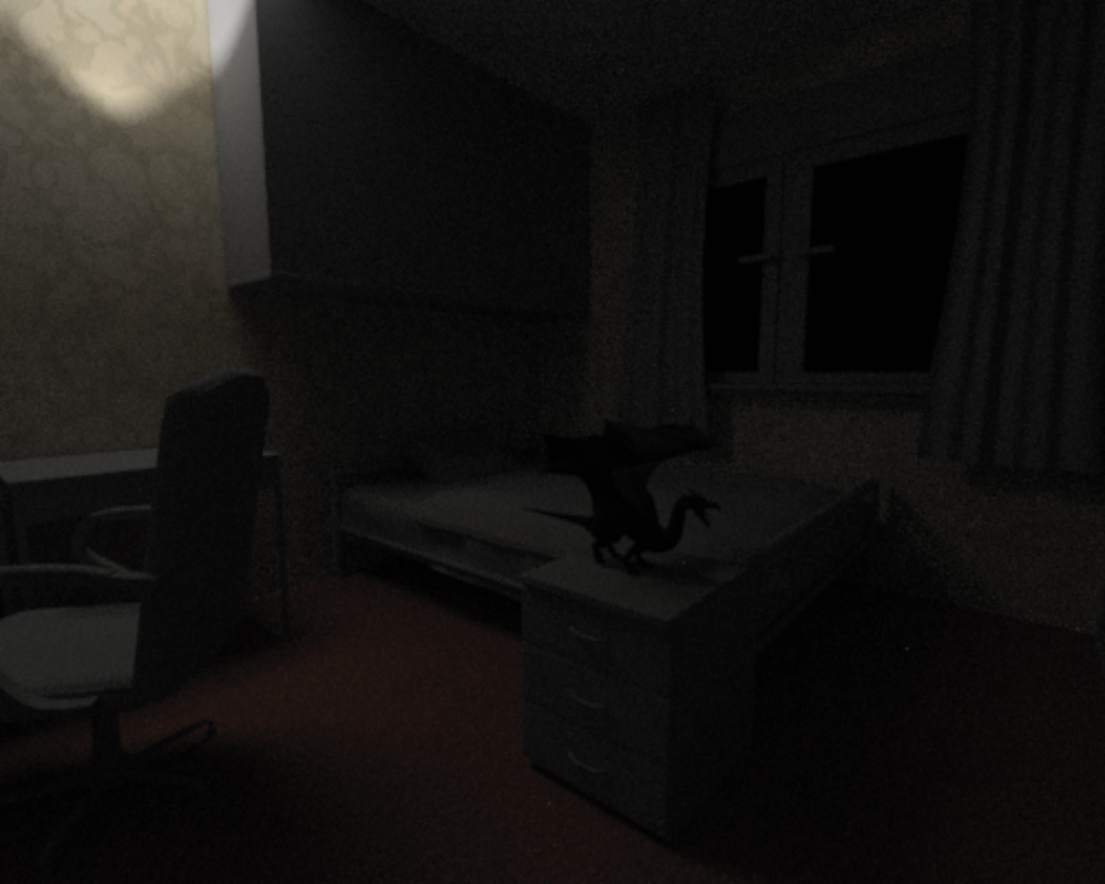 Für die Energieübertragung pro Pfad habe ich eine RGBA8 Textur verwendet. Nun nutze ich wieder 32F und nun gibt es auch keine Fireflies mehr. Lag also daran, dass wohl die Quantisierung der Energie dazu geführt hat, dass sie bei solchen ausreißern nicht verschwinden konnte. Oder sowas in der Art.