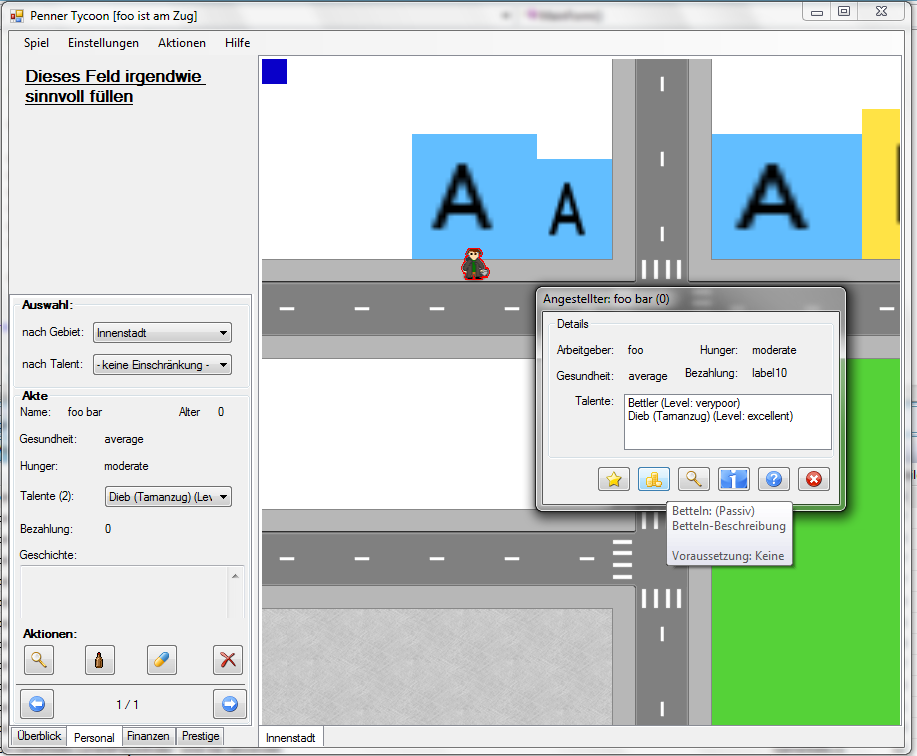 Dies ist mein Beitrag für die aktuelle ZFX-Action. Es handelt sich um ein Tycoon-Spiel der alten Schule (Fugger, Zoo Tycoon, etc.) mit einem speziellen Hintergrundthema: Man hat die Aufgabe durch geschicktes Einsetzen seiner Angestellten (Obdachlose) soviel Geld wie möglich zu erwirtschaften. In kleineren Etappen kann man Stück für Stück die Karriereleiter aufsteigen. Es ist möglich die Behörden zu bestechen, so dass man neue Leute immigrieren kann und diese sonst auch unbehelligt agieren können. Speziell sind auch die Bedürfnisse der Arbeiter, was sich speziell in Alkoholkonsum und anderen Grundbedürfnissen äußert. Wer sich nicht gut um seine Angestellten kümmert oder zu hartnäckig Gebiete abgrast, wird bald Probleme mit den Behörden bekommen.