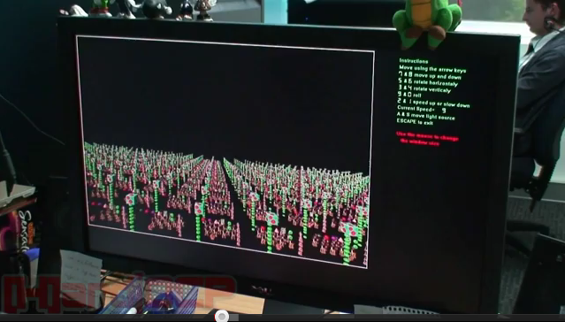 Laut jemanden, der im Forum sich das angeschaut hat, ist die innere Schleife sehr einfach und darin ist weder Multiplikation noch Division. Er verwendet MASS-CONNECTED-PROCESSING. Die Darstellung wabert ziemlich stark. In den alten Videos ist neben Shadowmapfehlern auch das Frustumculling zu sehen, da Punkte, die das Frustum nach außen hin berühren direkt verschwinden. Das ist in dem neuen Video nicht.