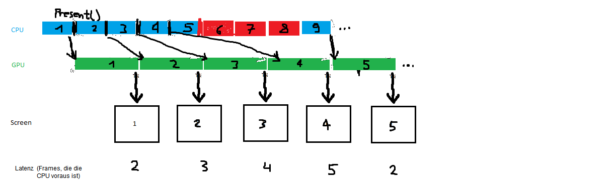 eXile, auf deine Bilder bezogen bedeutet das, dass die synchrone Grafik noch weiter auseinandergezogen wird, weil CPU und GPU nie gleichzeitig arbeiten. Die asynchrone Grafik bleibt zwar so kompakt, allerdings rutschen die Pfeile mächtig weit nach hinten, weil die asynchrone Verarbeitung bedeutet, dass die GPU erst auf dein aktuelles Present() reagiert, nachdem sie die fünf Bilder abgearbeitet hat, die vorher im Anweisungspuffer eingereiht waren. Du hast also tatsächlich mehr Bilder pro Sekunde, aber auch eine höhere Latenz zwischen CPU und GPU und damit eine trägere Reaktion. Mir persönlich sind 30 Hz mit einer Latenz von 35 ms lieber als 85 Hz mit einer Latenz von 0–100, also im Schnitt 50 ms.