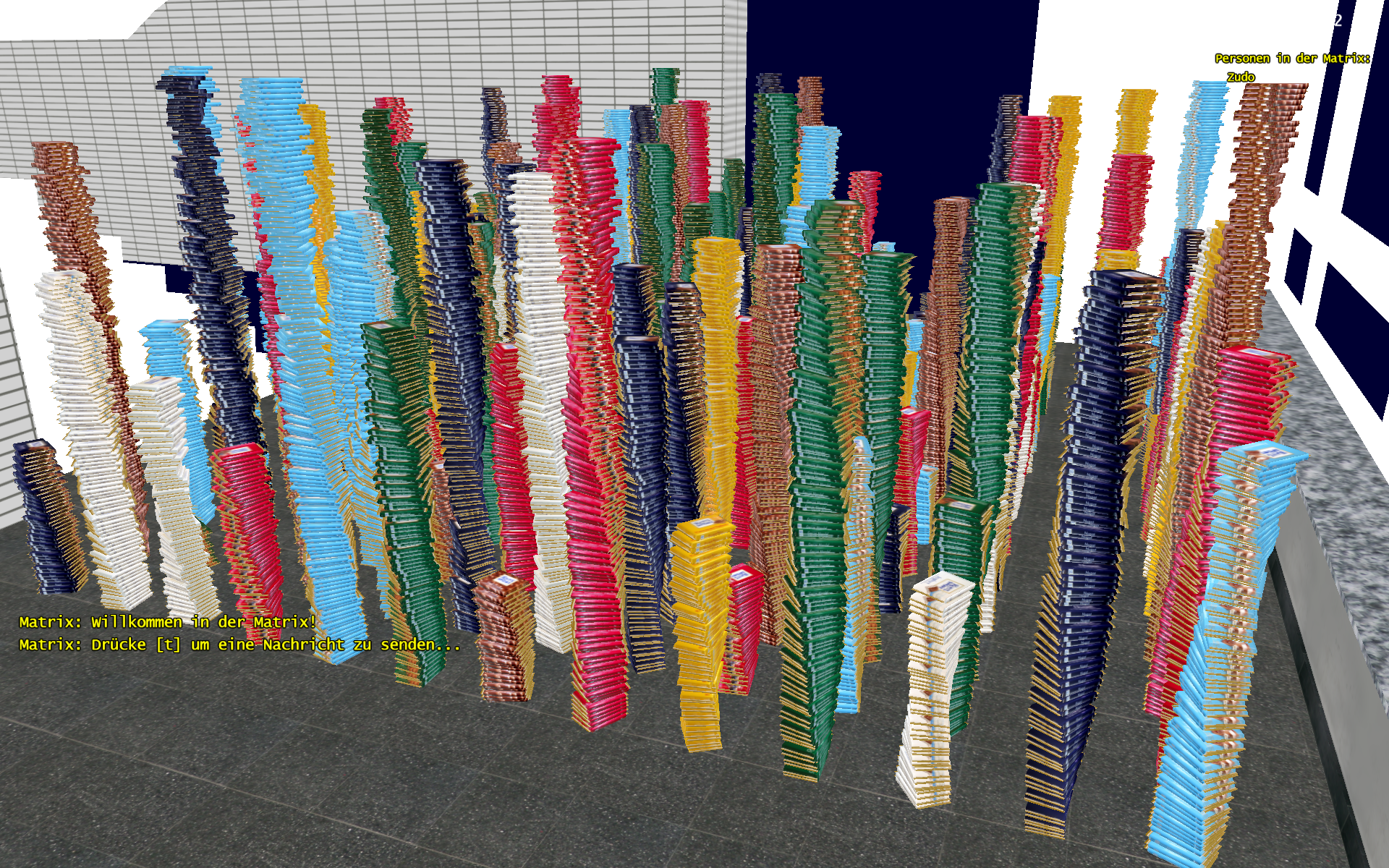 Zu sehen sind etwa 12.000 Schokotafeln einer bekannten Marke. Das ganze wurde am Anfang ohne Instanzing gezeichnet. Jede Tafel besteht aus zwei Objekte... das eine Objekt ist das Mittelstück und variiert in seiner Textur, das zweite sind außen die beiden Goldstreifen.