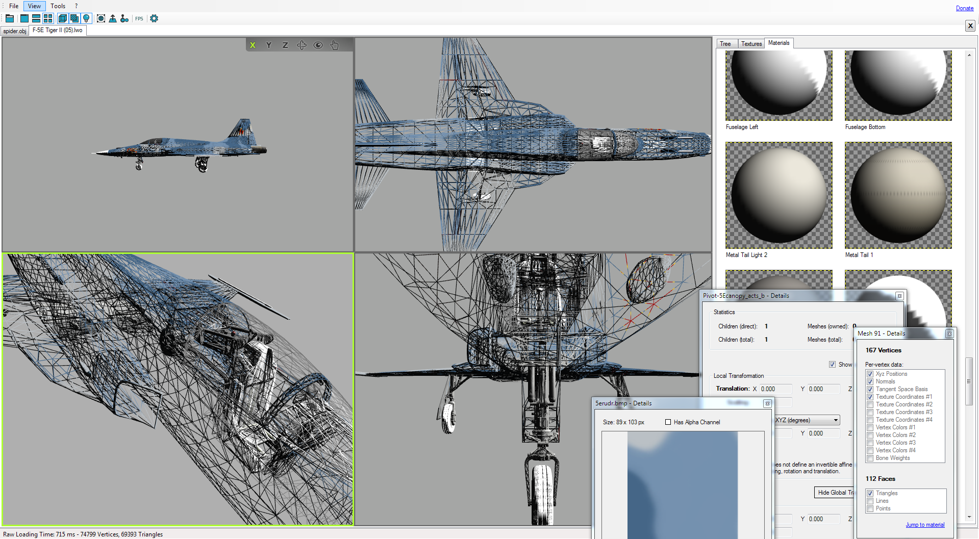 Sieht gut aus! Besonders das Animations-Interface ist sehr gut! Ich habe allerdings auch Probleme. Ich habe mit der initial geladenen Spinne ein bisschen rumgespielt, da ging alles noch. Aber schon beim Umschalten von Shading wurde eine der vier Ansichten irgendwie grünlich. Und nach dem ersten Laden von *irgendwas* konnte ich gar nicht mehr rumschauen. Die aktuell angeklickte Ansicht war komplett unsichtbar, die anderen Ansichten waren nur Schattenrisse, entweder dunkelgrau oder wieder jenes Hellgrün.