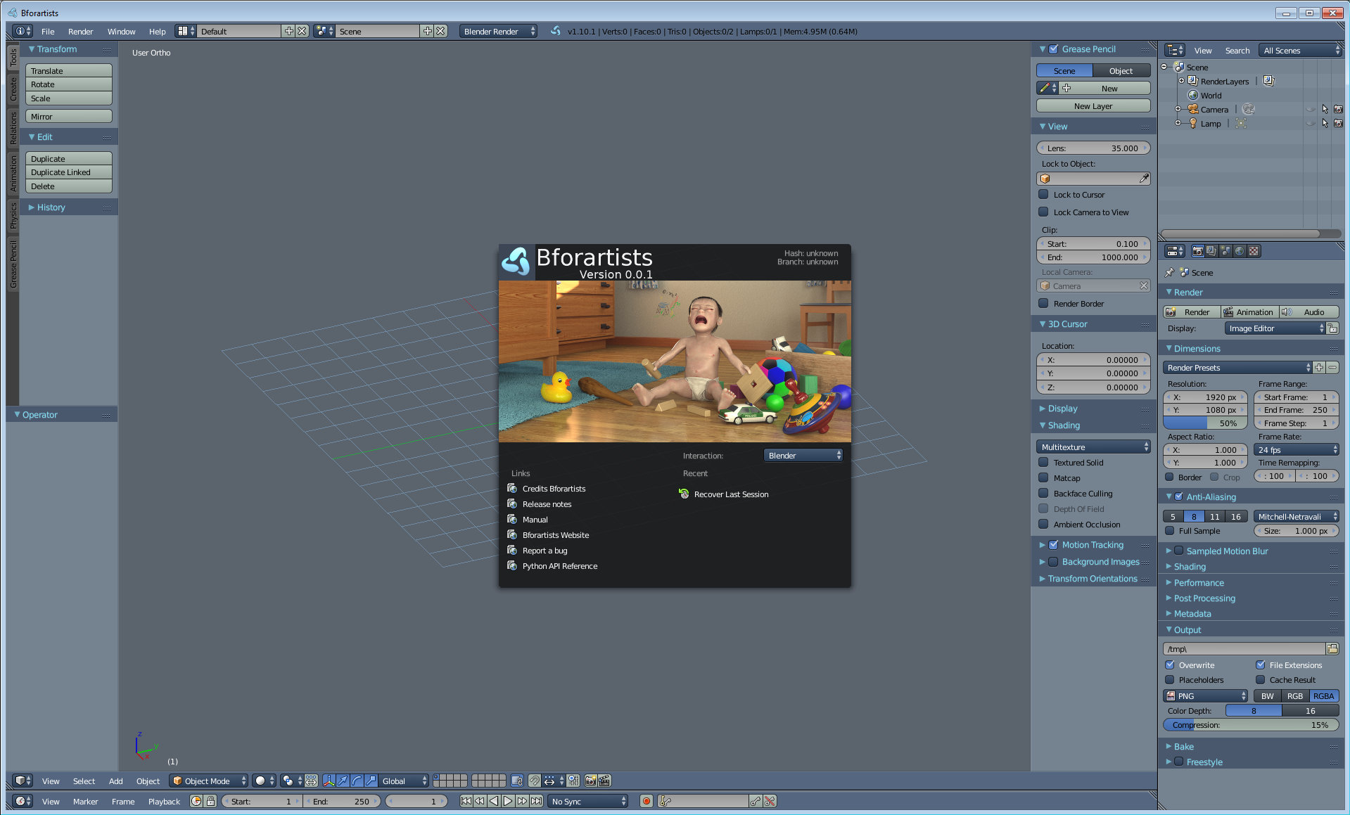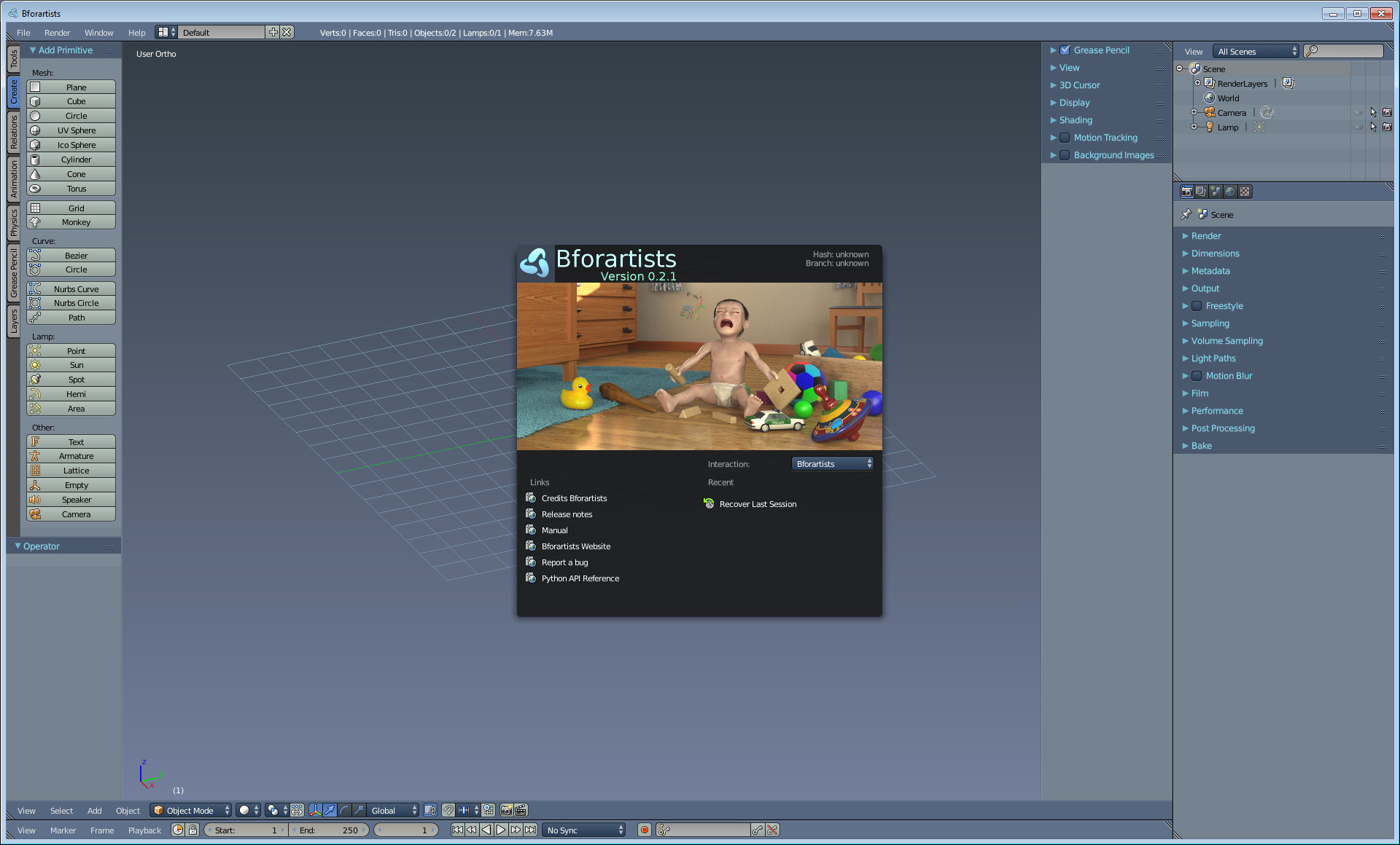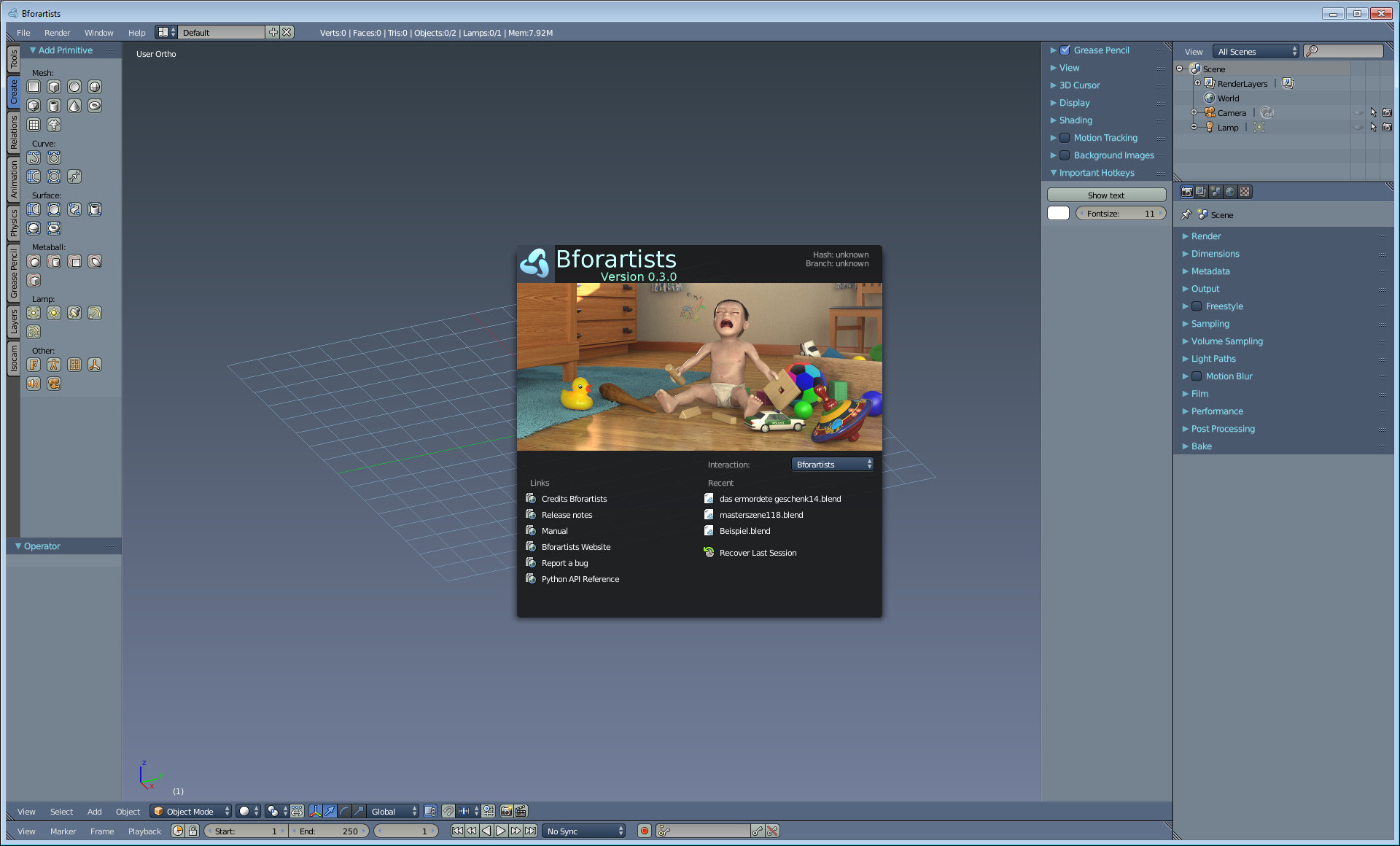 Und es gibt erste kleine Änderungen an der UI. Die Szenen Dropdown Box ist nun in den Properties. Gleiches gilt für die Renderer Auswahlbox. Und das Layer Widget ist ganz raus. Dafür ist das Layer Plugin drin und aktiv. Die Macke mit der offenen Konsole ist behoben. Genauso wie die Macke mit der Warnung beim Laden eines Blendfiles. War eine saublöde Idee die interne Versionsnummer zu ändern. Denn Blender/Bforartists checkt auf Version 2.72, weil es da wichtige Änderungen am Blender File Format gab. Die interne Versionsnummer sollte also höher als 2.72 liegen. So lernt man eben dazu :)