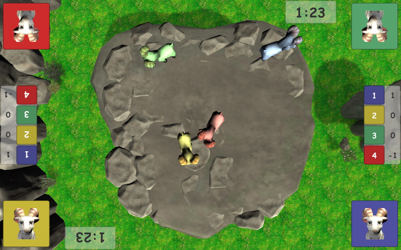 ich entwickle seit einiger Zeit kleinere Spiele und möchte Euch hier mal meine neuestes Spiel "Goats" vorstellen. Derzeit ist es nur für Android verfügbar. Es handelt sich um ein Multiplayer Spiel (bis 4 Spieler auf einem einzigen Gerät). Bei vier Spielern ist's natürlich am besten auf nem Tablet, aber auch auf nem normalen Smartphone ist es sehr gut spielbar. Das Spiel war, eine Art Multiplayer-Party-Spiel zu entwickeln, bei dem auch mal Leute mitspielen können, die ansonsten nicht so viel Erfahrung mit Spielen haben.