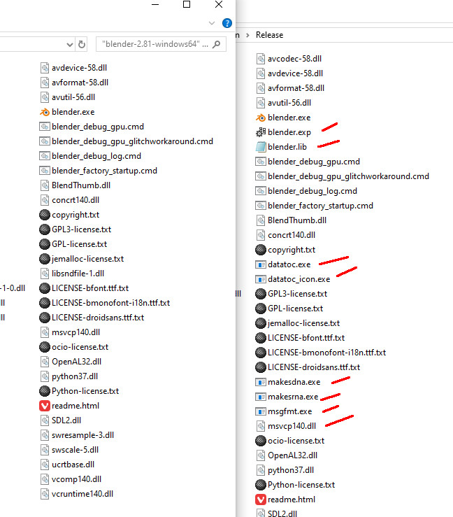 Bei der Fehlersuche bin ich dann drüber gestolpert dass eben die Release Version von Blender ein paar Dateien weniger hat als eine die ich selber kompiliere. Siehe Bild. Und seitdem suche ich mir die Griffel wund wie ich VS davon überzeugen kann auch bei meinem Build die DLL's statisch einzubinden. Ich bin da nur nicht wirklich erfolgreich. Halp ^^
