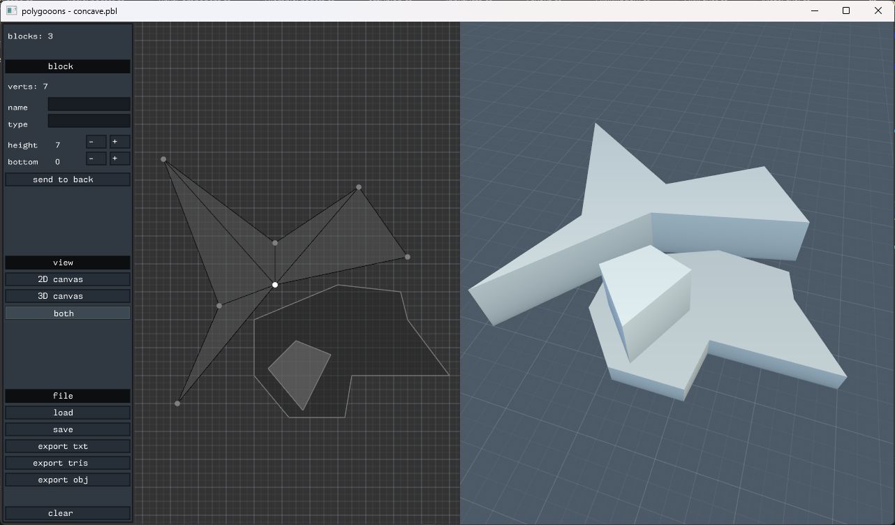 Ursprungsgedanke war, Polygone per Maus in 2D bearbeiten zu können. Dann irgendwie tesselieren, und einfache World-Y-Extrusion per Parameter dazu (Bodenhöhe, Blockhöhe), und schon kann man einfache 3D-Umgebungen für Prototyping basteln. Ein bischen wie Doom1-Levelgeometrie, mehr oder weniger.