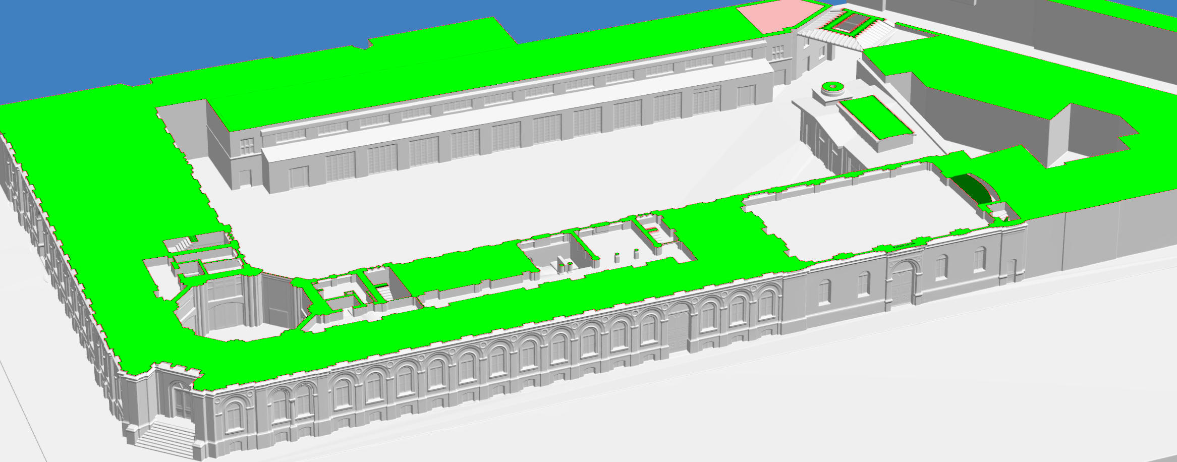Geht in Echtzeit, ist trivial zu implementieren (verglichen mit manueller Triangulierung) und sieht dann ungefähr so aus (nur, dass ich statt solidem Grün hier schwarz-rote Farbübergänge durch ein Signed Distance Field habe): Geht natürlich nur, wenn die Schrank-Geometrie geschlossen ist. Das gilt aber für CSG generall, also auch für die CPU-Variante.