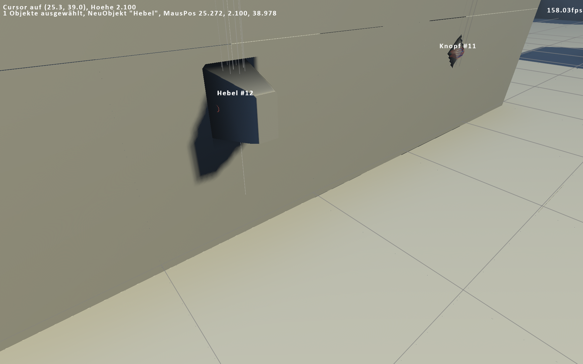 Viel ist passiert, wenig davon Gameplay. Der SurfaceGenerator pumpt immer noch einfarbige Flächen aus, die aber auf höchst komplizierte Weise berechnet, aus der sich später hoffentlich einfach mehr machen lässt. Im Bild sichtbar die erste Boden-Druckplatte und zwei Fallgitter, die mit sowas angehoben werden können. Die Bodenplatte ist nebenbei der erste Usecase, wo ein Szenen-Element die SurfaceGeneration eines anderen Szenen-Elements modifiziert. Und drumherum einen schlichten Editor, mit dem man Blöcke und Objekte setzen, schieben, löschen, modifizieren kann, inklusive Undo