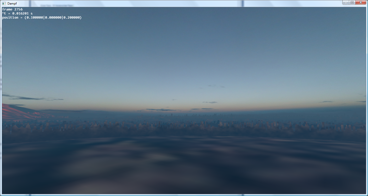 Weitere drei Tage später war die der wichtigste Teil der Kollisionsabfrage lauffähig, Texturen geladen, D3D9 gewrappt und die Lauffähigkeit auf schwächerer Hardware (meinem Eee-PC) sichergestellt und ich habe ein Bisschen mit ordentlichem Fog rumgespielt.